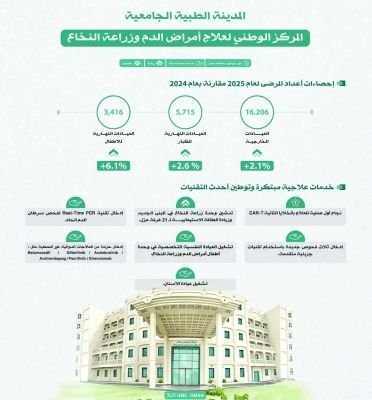 أما المركز الوطني لعلاج أمراض الدم وزراعة النخاع، فقد سجل إنجازات نوعية عام 2025م، من أبرزها نجاح أول عملية علاج بالخلايا التائية (CAR-T)، وتوسعة وحدة زراعة النخاع وزيادة طاقتها الاستيعابية إلى 21 غرفة عزل، إلى جانب إدخال تقنيات تشخيصية جينية متقدمة، وتشغيل العيادة النفسية التخصصية في وحدة أطفال أمراض الدم وزراعة النخاع، وتشغيل عيادة الأسنان، وإدخال حزمة من العلاجات الدوائية الجديدة.