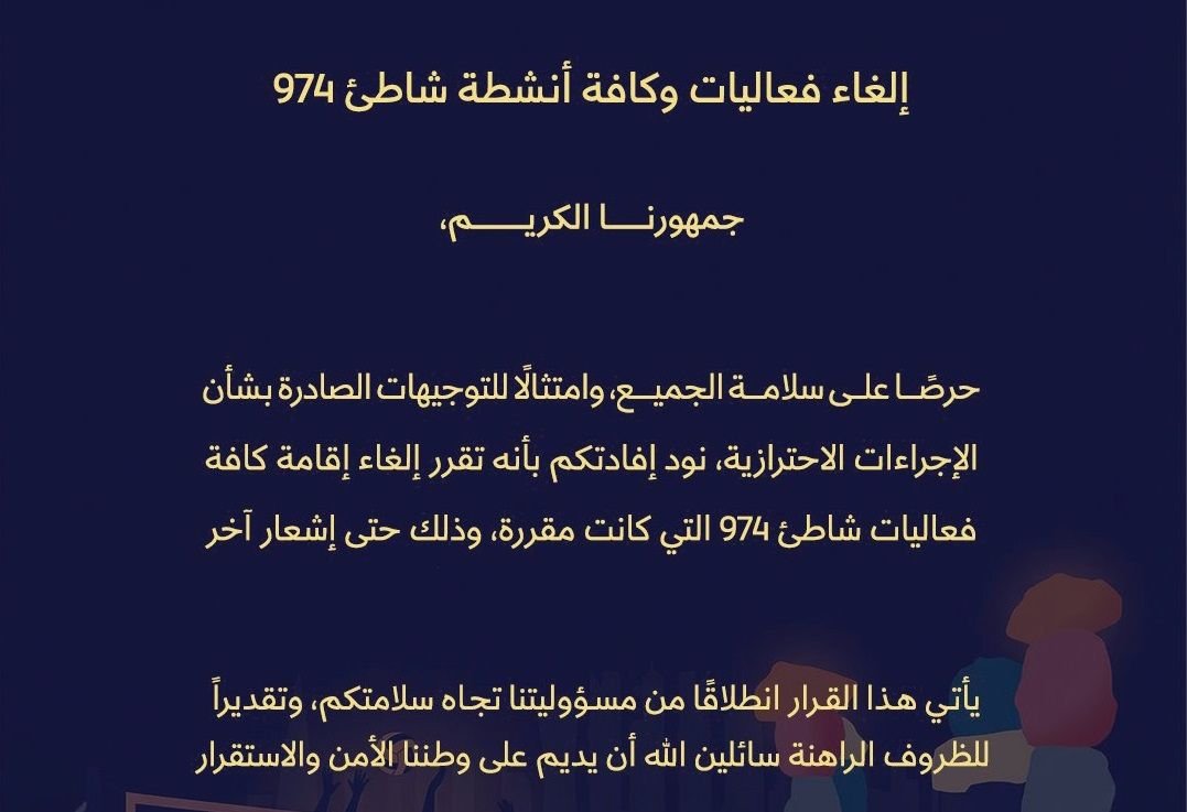 كما أعلنت الوزارة إلغاء إقامة كافة فعاليات وأنشطة شاطئ 974 حتى إشعار آخر، ضمن الإجراءات الاحترازية المتبعة، مشيرة إلى أن هذا القرار يأتي في الإطار ذاته المتعلق بالحفاظ على الصحة والسلامة العامة. واختتمت الوزارة بيانها بالدعاء أن يديم على الوطن نعمة الأمن والاستقرار.