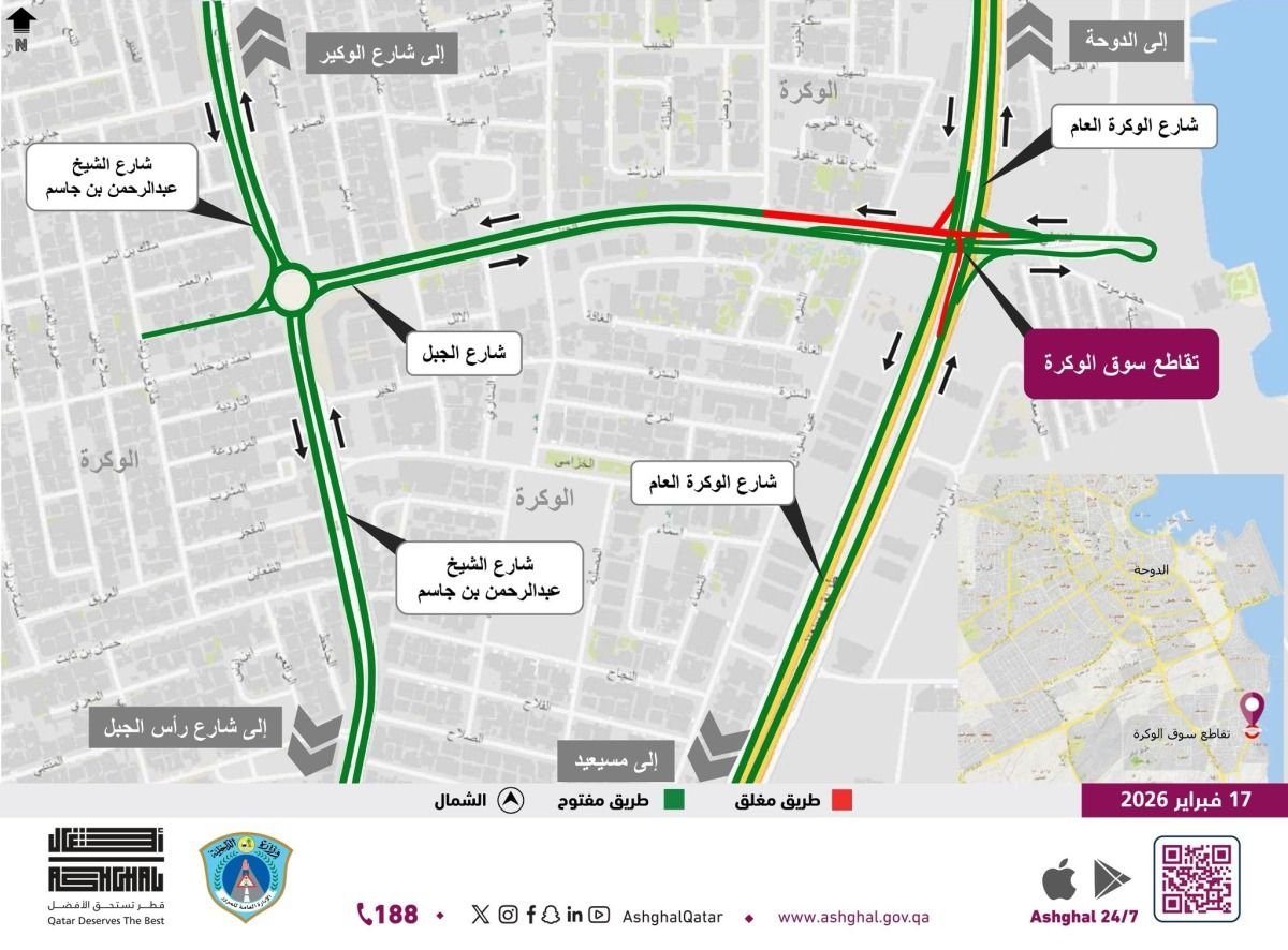 أعلنت هيئة الأشغال العامة "أشغال" عن إغلاق جزئي في تقاطع سوق الوكرة ليلا في شارع الجبل، مع الإبقاء على باقي اتجاهات التقاطع مفتوحة أمام الحركة المرورية، وذلك يوم الخميس الموافق 19 فبراير 2026، من الساعة الثانية صباحا وحتى الساعة السادسة صباحا، لتنفيذ أعمال طبقة الأسفلت النهائية، وبالتنسيق مع الإدارة العامة للمرور.