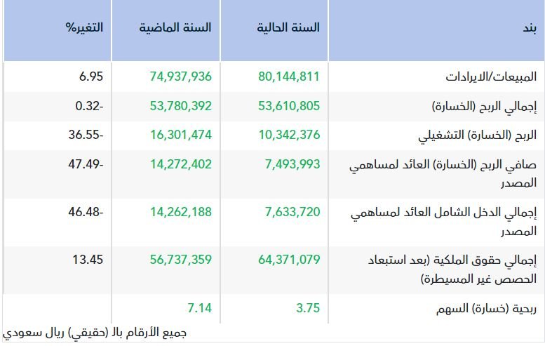 ووفقا لبيانات الشركة المالية، الصادرة على "تداول" اليوم الثلاثاء، بلغ صافي الربح العائد للمساهمين 7.49 مليون ريال في العام الماضي، مقابل 14.27 مليون ريال في عام 2024م.