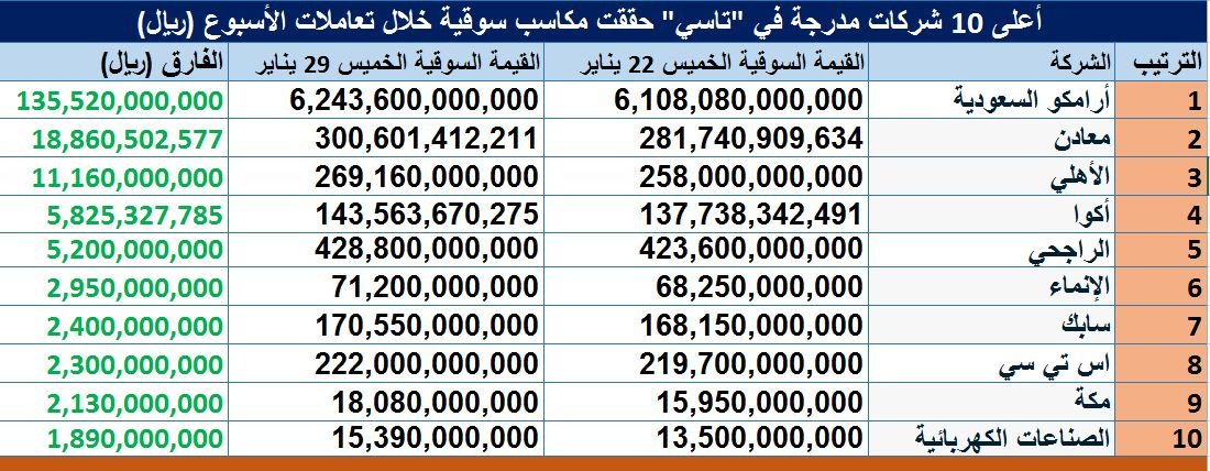 وحققت "أرامكو السعودية" أعلى مكاسب سوقية بين الشركات المدرجة في "تاسي" خلال تعاملات الأسبوع الحالي؛ بواقع 135.52 مليار ريال، تلاها "معادن" بزيادة في قيمتها السوقية بواقع 18.86 مليار ريال، ثم "الأهلي" بواقع 11.16 مليار ريال.