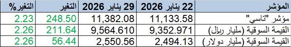 وسجل المؤشر العام للسوق "تاسي" ارتفاعاً نسبته 2.23%، بمكاسب بلغت 248.5 نقطة، صعد بها إلى مستوى 11,382.08 نقطة، مقابل 11,133.58 نقطة بالأسبوع الماضي.