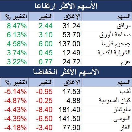 وجاء إغلاق 73 سهما باللون الأخضر، تصدرها سهم "مرافق" بارتفاع نسبته 8.47%، وكان المركز الثاني لسهم "صناعة الورق" الذي صعد 6.13%.