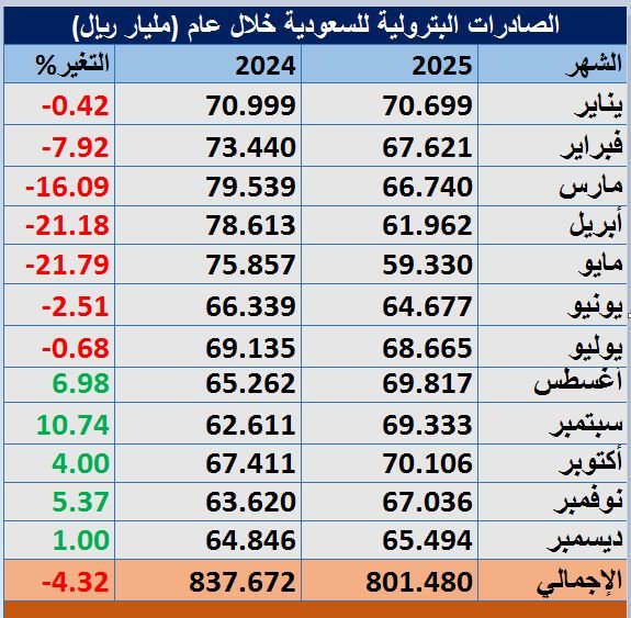 وبلغت حصيلة صادرات السعودية البترولية 801.48 مليار ريال في عام 2025م، مقابل 837.67 مليار ريال في العام السابق.