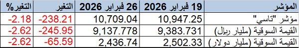 مباشر - ثابت شحاتة: شهد سوق الأسهم السعودية أداء سلبيا خلال الأسبوع المنتهي في 26 فبراير 2026، في ظل هبوط شبه جماعي للقطاعات، وسط تراجع السيولة مقارنة بالأسبوع الماضي.