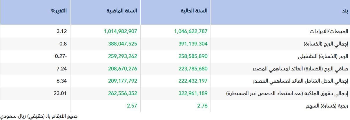 وأوضحت الشركة وفقا لبيان لها اليوم الأحد على "تداول" أن صافي الربح العائد لمساهمي المصدر بلغ 223.78 مليون ريال، مقابل 208.67 مليون ريال في العام 2024.