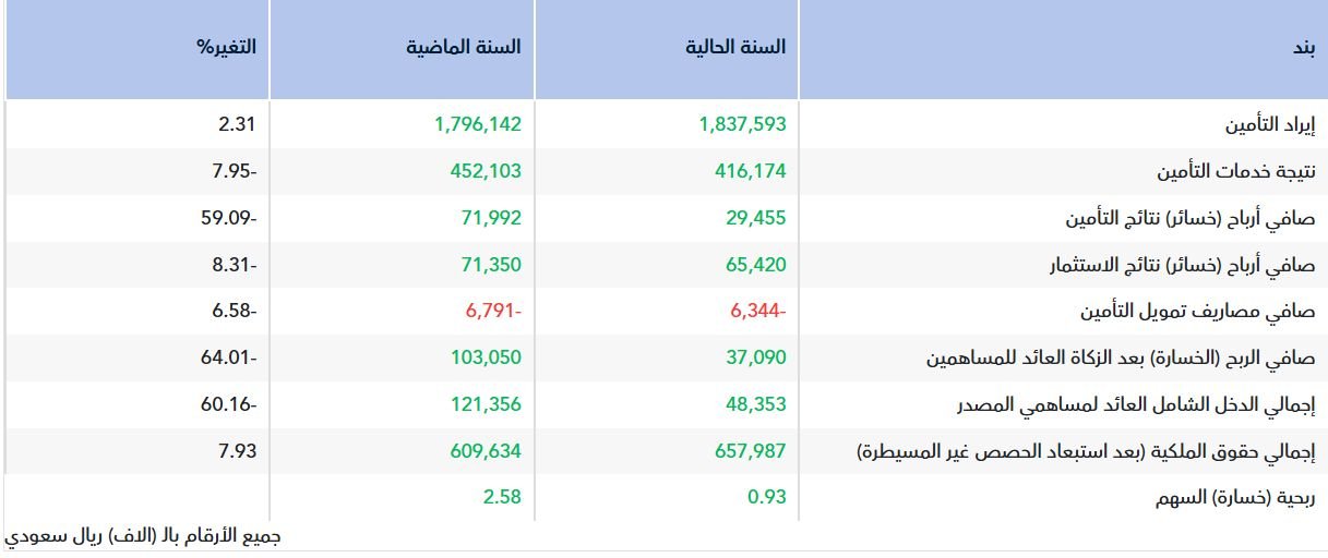 كما انخفض صافي أرباح نتائج التأمين إلى 29.46 مليون ريال، مقابل 71.99 مليون ريال في العام السابق، بتراجع حاد نسبته 59.09%.
