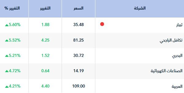 وعلى صعيد أداء الأسهم، شملت المكاسب 74 سهما بصدارة سهم "ثمار"، الذي صعد 5.6%، تلاه سهم "تكافل الراجحي" بارتفاع نسبته 5.52%.