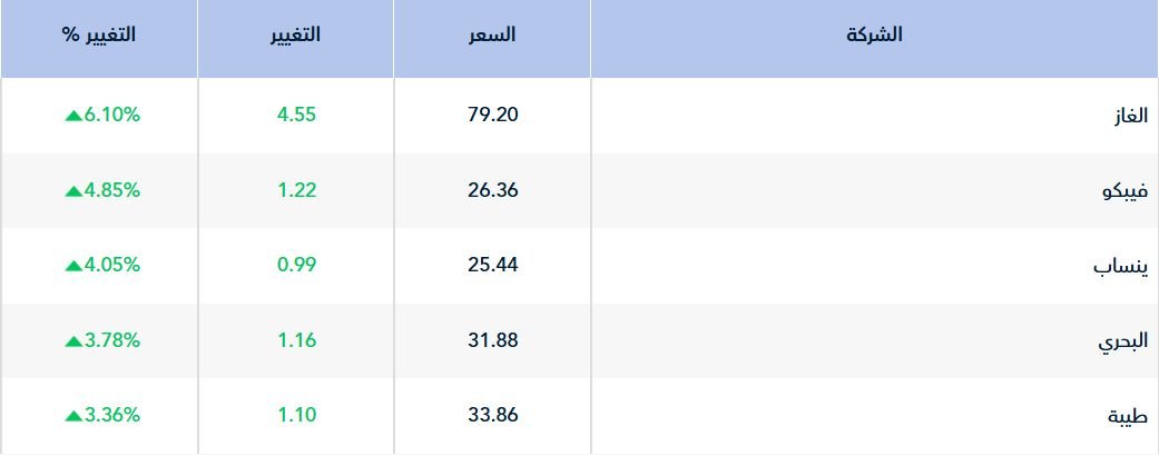 وسجل أداء 72سهمًا ارتفاعاً، تصدرها سهم " الغاز" بارتفاع 6.10%، تلاه سهم "فيبكو" بنسبة 4.85%.
