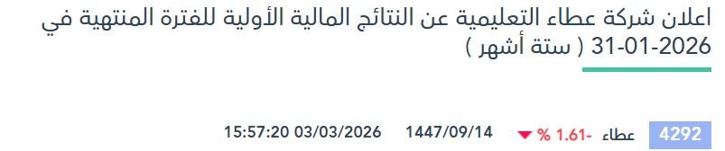 وحققت "عطاء" أرباحا صافية خلال فترة الـ 6 أشهر المنتهية في 31 يناير/ كانون الثاني 2026م بقيمة 59.33 مليون ريال، لتسجل زيادة على أساس سنوي بنسبة 1.99%؛ مقارنة مع 58.17 مليون ريال في الفترة المماثلة من العام المالي الماضي.