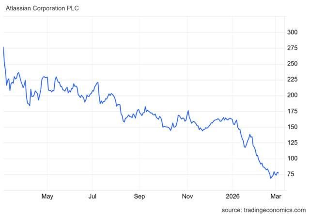 استهل سهم TEAM عام 2025 بمكاسب قوية خلال يناير، قبل أن تتراجع أحجام التداول تدريجياً ويتعرض لضغوط بيعية حادة أدت إلى موجة هبوط ممتدة من فبراير 2025 حتى فبراير 2026، هبط خلالها السعر من مستوى 326 دولاراً إلى نحو 68 دولاراً، مقترباً من مستويات دعم تاريخية.