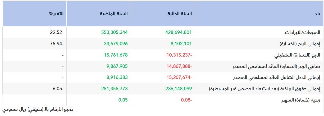وبلغت خسارة السهم خلال عام 2025 نحو 0.08 ريال، مقارنة بربحية بلغت 0.05 ريال للسهم في عام 2024.