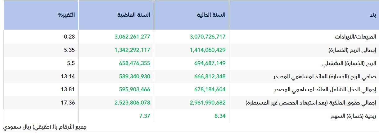 وسجلت الشركة ارتفاعاً في الإيرادات بنسبة 0.28% لتصل إلى نحو 3.07 مليار ريال خلال عام 2025، مقارنة 3.06 مليار ريال في عام 2024.