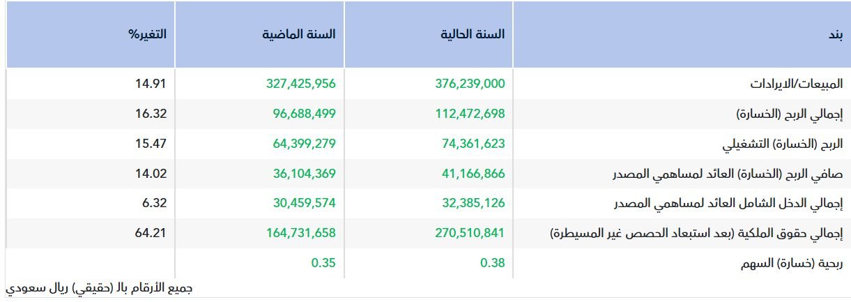 وعلى صعيد الإيرادات، ارتفعت المبيعات بنسبة 14.91% لتبلغ 376.24 مليون ريال خلال عام 2025، مقارنة 327.43 مليون ريال في العام السابق.