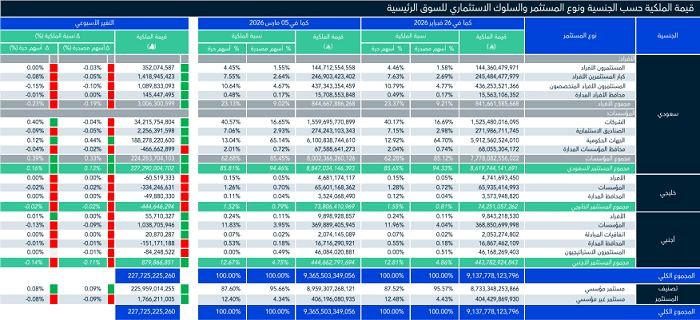وارتفعت قيمة ملكية المستثمرين الأجانب خلال الأسبوع الماضي إلى 444.66 مليار ريال، مقابل 443.78 مليار ريال بالأسبوع السابق، المنتهي في 26 فبراير 2026.