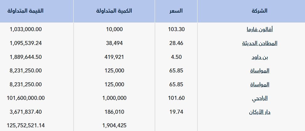ووفقاً لبيانات "تداول"، تم تنفيذ أكبر الصفقات من حيث القيمة على سهم من "الراجحب" والتي بلغت قيمتها 101.60 مليون ريال، بكيمة بلغت مليون سهم بسعر 101.60 ريال للسهم.