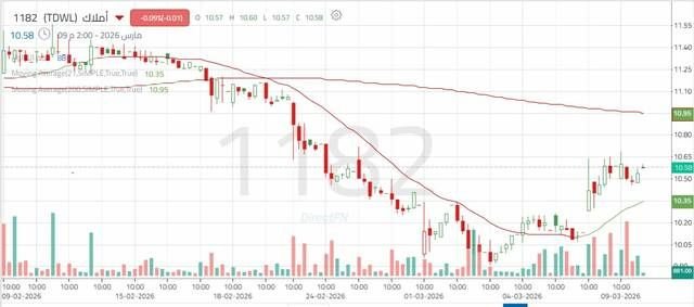 ملخص حركة السعر: يتحرك سهم أملاك ضمن اتجاه هابط ثانوي يعكس ضغوطًا واضحة على الأداء السعري خلال الفترة الأخيرة. وتظهر الحركة استمرار تسجيل مستويات أقل، ما يؤكد سيطرة القوة البيعية، وافتتح السهم جلسة اليوم على هبوط ملحوظ ويقترب السعر من مستوى دعم هام بناءً على نسب فيبوناتشي التصحيحية عند 10.50 ريال، يجب الحفاظ على الدعم لتجنب المزيد من التراجعات نحو 10.20 ريال – 10.15 ريال. وستظل النظرة السلبية قائمة طالما يتداول السعر دون المقاومة الرئيسية حول 11.65 ريال.