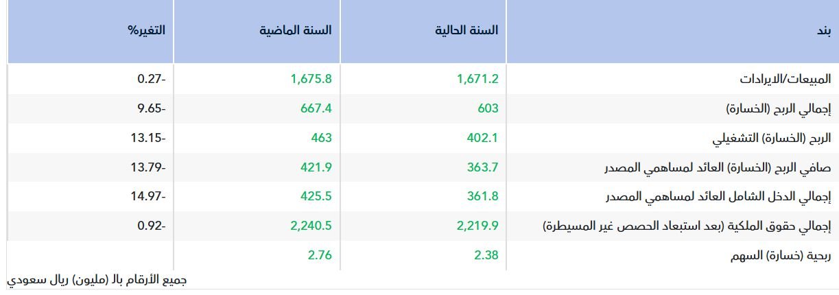 كما تراجع الربح التشغيلي إلى 402.1 مليون ريال مقارنةً بنحو 463 مليون ريال في العام السابق، بانخفاض نسبته 13.15%، فيما بلغ إجمالي الربح 603 ملايين ريال مقابل 667.4 مليون ريال خلال عام 2024.