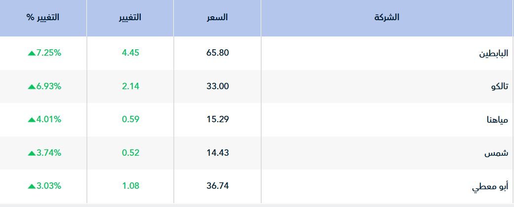 وسجل أداء 147سهمًا ارتفاعاً، تصدرها سهم " البابطين" بارتفاع 7.25%، تلاه سهم "تالكو" بنسبة 6.93%