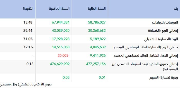 وتراجع إجمالي المبيعات/الايرادات بنسبة 13.48%، إلى 58.79 مليون ريال مقابل 67.94 مليون ريال في عام 2024، وذلك نتيجة انخفاض حصة الشركة من نتائج أعمال شركة زميلة.