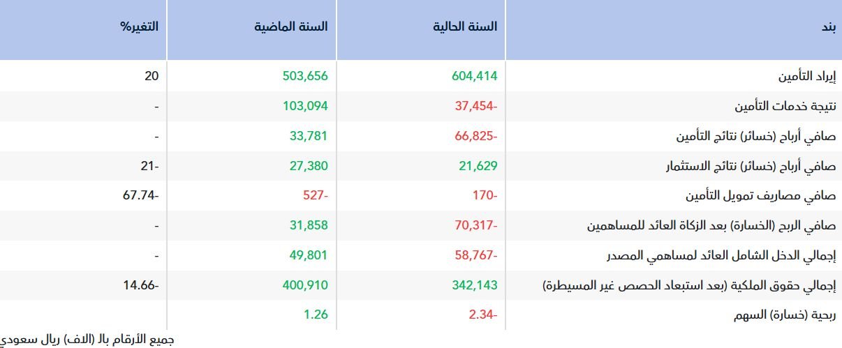 وقالت الشركة إن صافي الربح بعد الزكاة انخفض بمقدار 102 مليون ريال سعودي مقارنة بالعام الماضي،وذلك بسبب انخفاض نتائج خدمات التأمين بمقدار 100 مليون ريال سعودي نتيجة زيادة المطالبات المتكبدة، والاعتراف بتكاليف اقتناء الوثائق، إضافة إلى مكون الخسارة في قطاعي تأمين المركبات والتأمين الطبي.