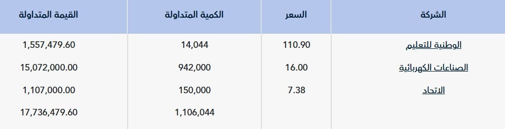 ووفقاً لبيانات "تداول"، تم تنفيذ أكبر الصفقات من حيث القيمة على سهم "الصناعات الكهربائية" والتي بلغت قيمتها 15.07 مليون ريال، بكيمة بلغت 942 ألف سهم بسعر 16 ريالا للسهم.