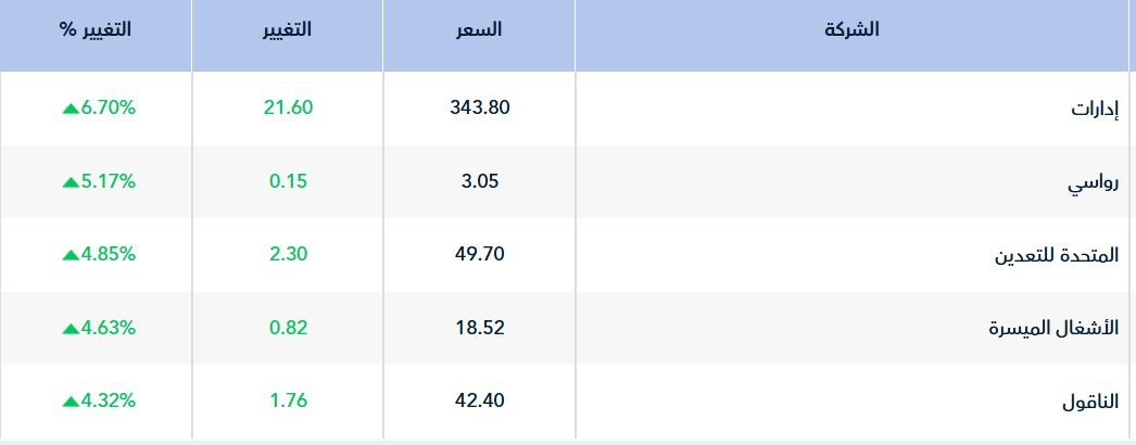 وسجل أداء 72سهمًا ارتفاعاً، تصدرها سهم " إدارات" بارتفاع 6.70%، تلاه سهم "رواسي" بنسبة 5.17%.