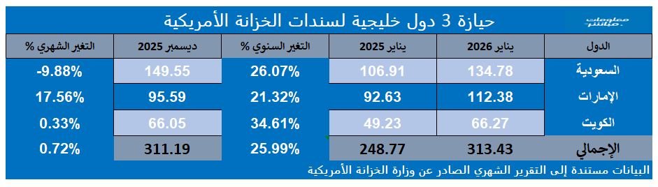 بلغت قيمة حيازة المملكة العربية السعودية ودولتي الإمارات العربية المتحدة والكويت خلال الشهر المذكور 313.43 مليار دولار، مقابل 268.77 مليار دولار في يناير/كانون الثاني 2025، بزيادة سنوية 16.62%، وذلك بحسب إحصائية "معلومات مباشر" المستندة لبيانات وزارة الخزانة الأمريكية.