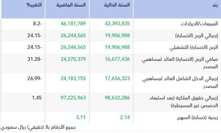 وانخفضت إيرادات الشركة بنسبة 8.2% في عام 2025 إلى 42.39 مليون ريال، مقابل 46.18 مليون ريال في العام السابق.