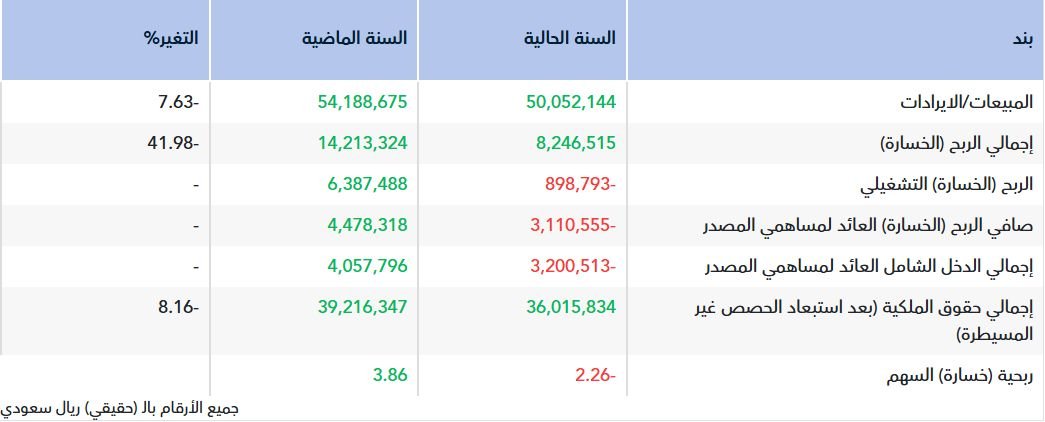 ووفقا للنتائج المالية السنوية للشركة اليوم الخميس على "تداول" فقد بلغ صافي الخسارة العائد لمساهمي المصدر نحو 3.11 مليون ريال، مقابل صافي ربح بلغ 4.47 مليون ريال ي عام 2024.