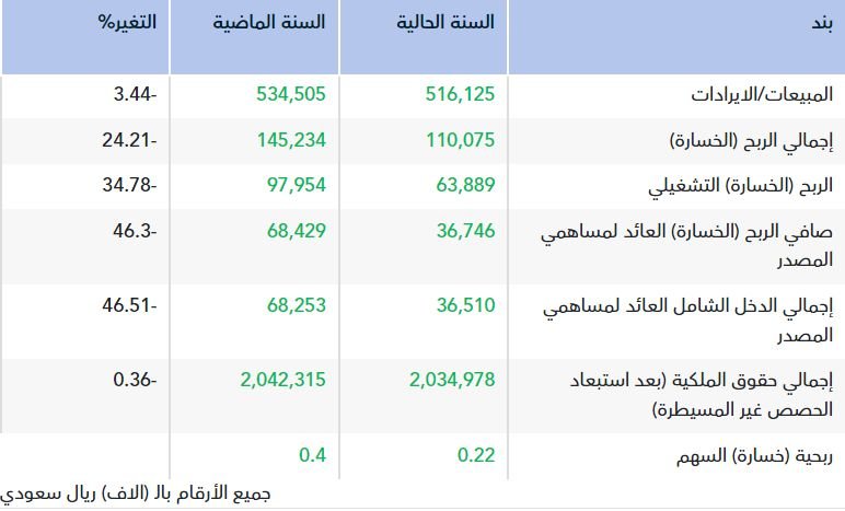 وانخفضت إيرادات الشركة بنسبة 3.44% في عام 2025م لتصل إلى 516.13 مليون ريال، مقابل 534.5 مليون ريال في العام السابق.