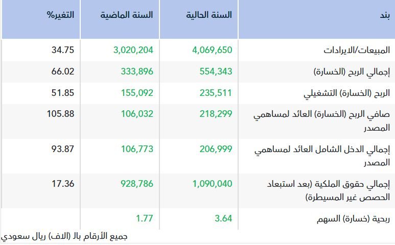 ووفقا لبيانات الشركة المالية، الصادرة على "تداول" اليوم الاثنين، بلغ صافي الربح العائد للمساهمين 218.3 مليون ريال، مقابل 106.03 مليون ريال في عام 2024م.