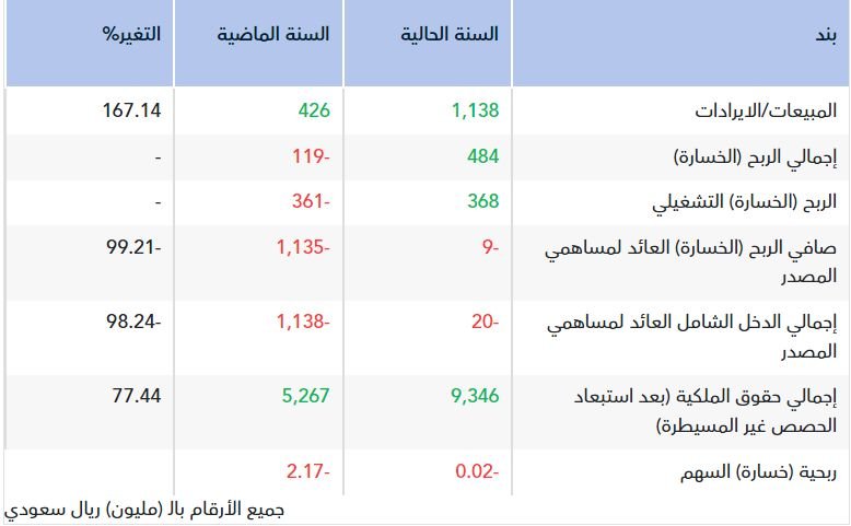 ووفقا لبيانات الشركة المالية، الصادرة على "تداول" اليوم الثلاثاء، بلغ صافي الخسارة العائد للمساهمين 9 ملايين ريال، مقابل 1.135 مليار ريال في عام 2024م.