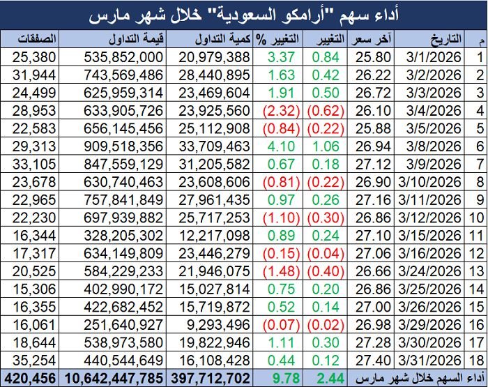 مباشر ـ ثابت شحاتة: شهد سهم أرامكو السعودية، ارتفاعا ملحوظا خلال شهر مارس 2026، في ظل التحركات الإيجابية أسواق النفط العالمية، على خلفية الأحداث الإقليمية الأخيرة.