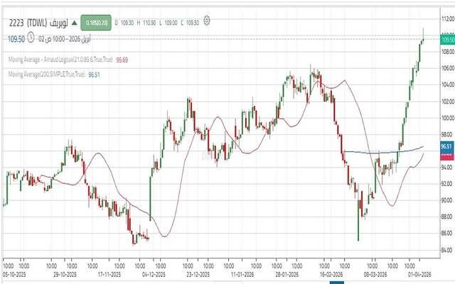 ويدعم ذلك امتداد الصعود نحو 111.30 ريال – 113.80 ريال، والثبات أعلى هذه المستويات يدعم استهداف مستويات أعلى بالقرب من 116 ريال – 118.90 ريال.