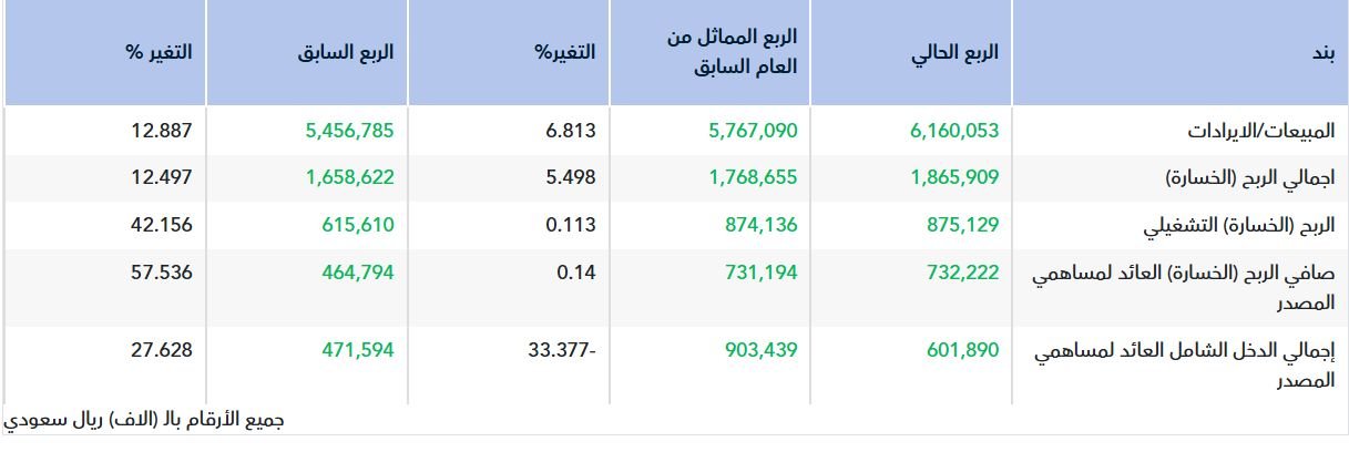 وفيما يتعلق بالإيرادات، ارتفعت مبيعات الشركة بنسبة 6.81% على أساس سنوي لتصل إلى 6.16 مليار ريال، مقارنة بـ 5.77 مليار ريال في الربع المقارن من العام الماضي.
