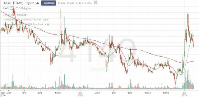 بدأ سهم صادرات تداولاته عام 2025، في نطاق عرضي بين دعم 2.00 ريال ومقاومة 2.60 ريال؛ مما يعكس حالة توازن بين المشترين والبائعين دون اختراق مستويات رئيسية.