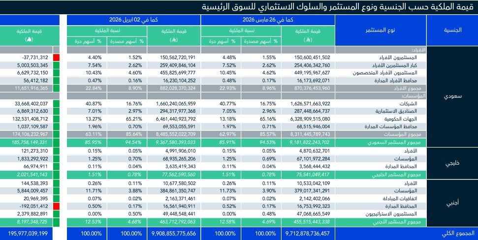 وجاءت الزيادة مع ارتفاع قيمة ملكية المؤسسات السعودية بواقع 174.1 مليار ريال، لتصل إلى 8.485 تريليون ريال، مقابل 8.311 تريليون ريال في نهاية تعاملات الأسبوع السابق.