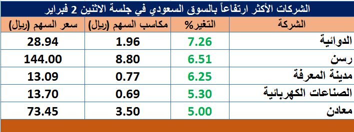 وتصدر سهم "الدوائية" الأسهم الأكثر ارتفاعا بالسوق في تعاملات اليوم بنسبة 7.26%، ليغلق عند مستوى 28.94 ريال للسهم.