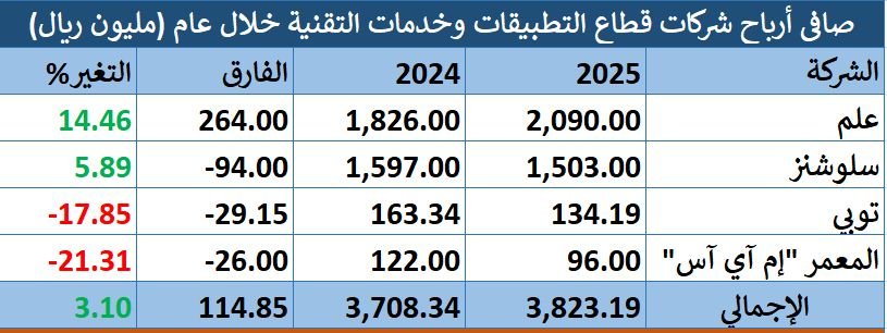 وجاء نمو أرباح القطاع بدعم رئيسي من شركة "عِلم"، التي سجلت ارتفاعاً بصافي أرباحها بنسبة 14.46%، وبما يعادل 264 مليون ريال، لتصل إلى 2.09 مليار ريال خلال عام 2025، مقابل 1.83 مليار ريال في العام السابق، لتستحوذ على الحصة الأكبر من أرباح القطاع.
