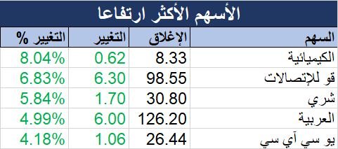 وعلى صعيد أداء الأسهم، شملت المكاسب 112 سهما بصدارة سهم "الكيميائية"، الذي صعد 8.04%، تلاه سهم "قو للاتصالات" بنسبة ارتفاع بلغت نسبته 6.83%.