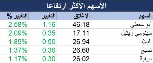 واقتصرت الارتفاعات على 24 سهما، جاء على رأسها سهم "أبو معطي" الذي صعد 2.58%، تلاه سهم "سينومي ريتيل" بارتفاع نسبته 2.09%.