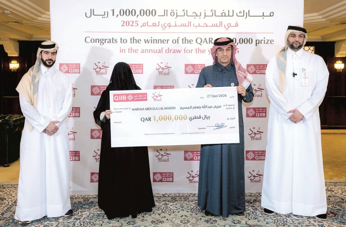 أعلن الدولي الإسلامي عن الفائزة المحظوظة بجائزة المليون ريال لعام 2025 ضمن السحب الخاص بجوائز حساب التوفير «جود»، حيث قام السيد جمال عبد الله الجمال نائب الرئيس التنفيذي، بتسليم العميلة مريم عبدالله جعفر المسيح شيكاً بقيمة مليون ريال قطري، وذلك خلال حفل خُصص لتسليم الجائزة الكبرى لحساب التوفير «جود» لعام 2025، أُقيم في المقر الرئيسي للبنك بشارع حمد الكبير، بحضور عدد من كبار مسؤولي الدولي الإسلامي.