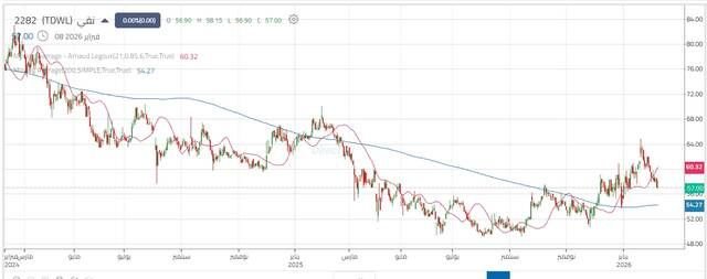 والثبات دون مستوى 59 ريال — الذي تحوّل حاليًا إلى مقاومة — قد يدفع السعر نحو مستوى الدعم التالي عند 55.90 ريال.