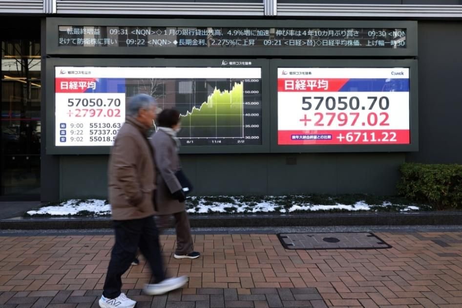 ارتفع المؤشر نيكاي الياباني إلى مستوى قياسي يوم الاثنين وتجاوز مستوى 57 ألف نقطة لأول مرة في بداية التعاملات، وذلك بعد فوز رئيسة الوزراء ساناي تاكايتشي الساحق في الانتخابات العامة التي جرت الأحد.