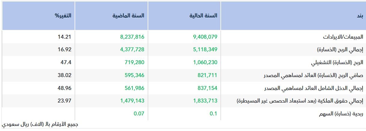 وعلى صعيد الأداء التشغيلي، ارتفع الربح التشغيلي بنسبة 47.4% ليصل إلى 1.06 مليار ريال، فيما ارتفع إجمالي الربح بنسبة 16.92% إلى 5.12 مليار ريال.