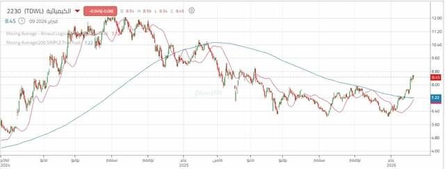 مباشر للأبحاث: شهد سهم الكيميائية ارتفاع ملحوظ خلال الجلسات الماضية، مخترقاً مقاومة محورية حول 7.60 ريال – 7.90 ريال، تشير المؤشرات الفنية إلى أداء إيجابي، إذ يتحرك مؤشر القوة النسبية (RSI) أعلى المستوى المحايد، في حين يُظهر مؤشر التقارب والتباعد للمتوسطات المتحركة (MACD) إشارات إيجابية.