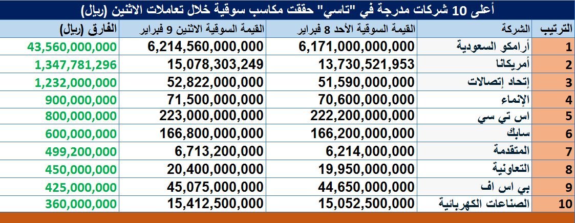 وقادت "أرامكو" ارتفاع القيمة السوقية للسوق السعودي بنهاية جلسة الاثنين؛ مع تسجيلها زيادة في قيمتها السوقية بواقع 43.56 مليار ريال، تليها "أمريكانا" بزيادة بلغت 1.35 مليار ريال، ثم اتحاد اتصالات "موبايلي" بزيادة قيمتها 1.23 مليار ريال.