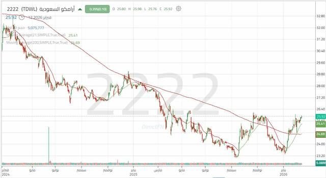 مباشر للأبحاث: نجح سهم شركة الزيت العربية السعودية "أرامكو" مؤخراً في اختراق خط اتجاه هابط طويل المدى، ويقترب السعر حالياً من مستوى المقاومة الرئيسي عند 25.95 ريال. وفي حال تمكن السهم من تجاوز هذه المقاومة مصحوباً بارتفاع ملحوظ في أحجام التداول، فمن المرجح أن تمتد الحركة الصاعدة لاستهداف المنطقة بين 26.50 ريال -26.65 ريال، تجاوز المستوى قد يفتح المجال لاستهداف مستوى 27.30 ريال.