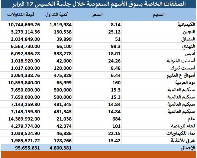 وفقاً لبيانات "تداول"، تم تنفيذ الصفقات على كل من سهم "الكيميائية" ، و"اللجين" ،و "المصافي" ، و"النهدي" ، و"أديس" ، و"أسمنت الشرقية"، "أسمنت تبوك" ،و"أسواق العثيم"، و"بوبا العربية " ، و"سبكيم العالمية"، و"علم" ، و"لجام للرياضة"، و"نماء للكيماويات"، و"هرفي للأغذية".